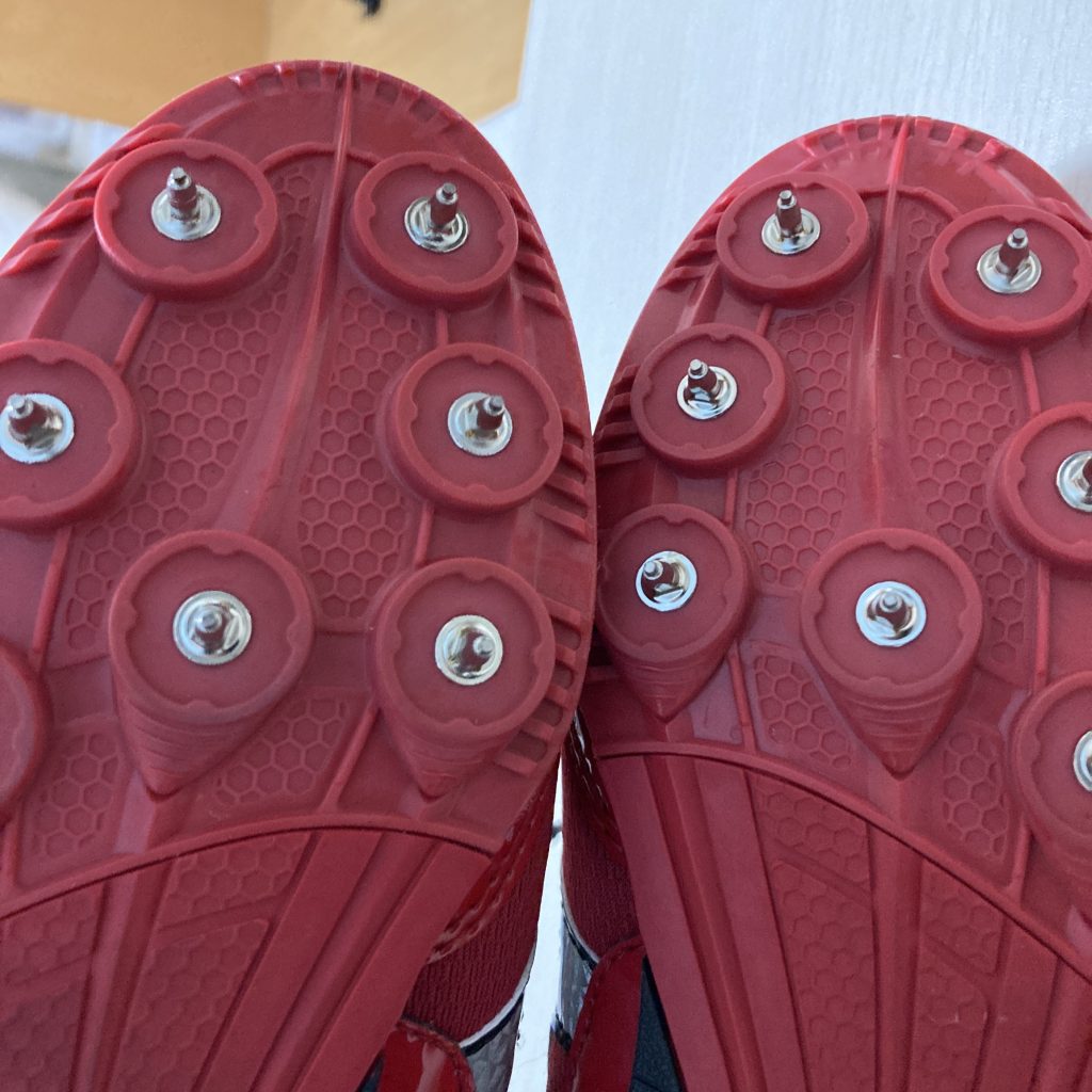 内側のピンを囲う山が潰れてますね。スプリント系のスパイクだから仕方ないね。